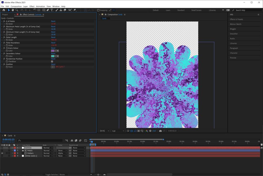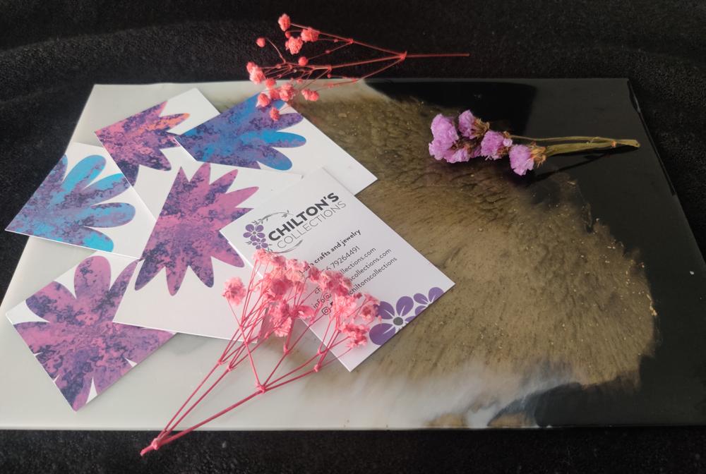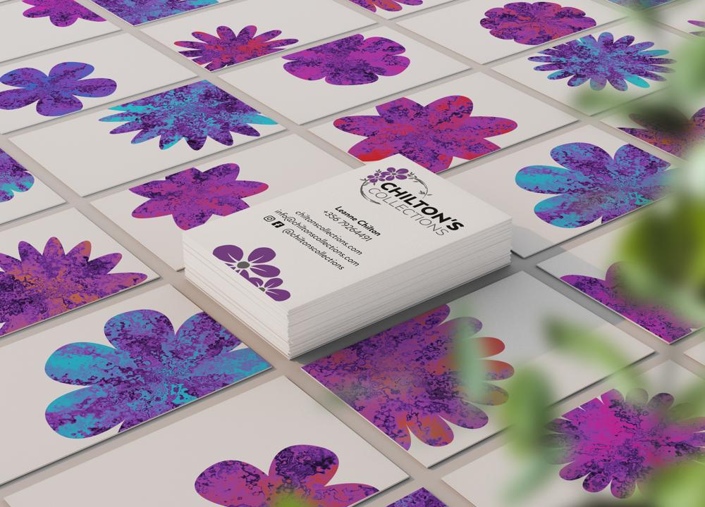 A one-woman show specialising in handmade resin artwork, Chilton’s Collections needed a set of cards and tags which fit in with her existing logo and helped promote her brand. Keeping with the theme and style of the resin pieces she produced, I used After Effects to generate flower shapes (a motif on the logo) with fractal noise to imitate the patterns that emerged in the resin. The rendered frames were then used to create 250 unique business card designs, along with some tags for attaching to the products.